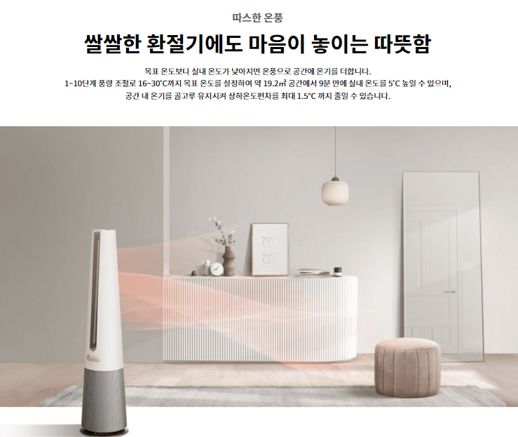 특히 환절기에는 온풍 모드와 청정 기능을 활용하면 필터를 거친 따뜻한 청정 바람으로 실내 공간을 원하는 온도로 유지할 수 있다. LG 씽큐 앱과 연동해 예약 설정을 활용하면 새벽이나 퇴근 후 귀가 시 실내 온도를 미리 설정할 수도 있다.