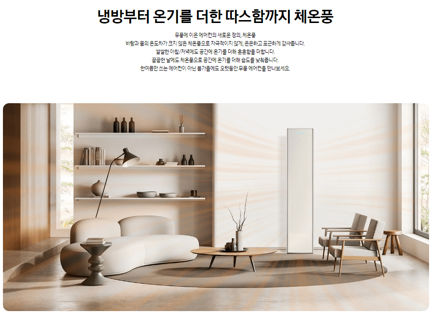 체온풍은 사람 몸과 온도 차가 크지 않은 30~40도의 은은하고 따뜻한 바람을 내보내 온기를 더하는 기능으로 바닥 난방을 하지 않는 환절기를 노렸다. 봄·가을에 쌀쌀한 아침·저녁이나 서늘하면서 습기가 높은 날 쾌적한 실내 온·습도 유지에 체온풍이 도움을 준다. 일반 청정이나 체온풍 청정 기능을 통해 환절기 미세먼지와 황사 걱정도 덜었다.