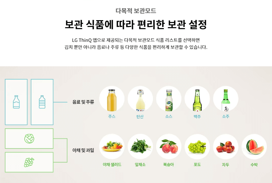 LG전자는 김치냉장고 사용패턴 데이터를 분석한 결과 김치냉장고가 김장철을 제외하고는 야채·과일 보관, 냉동 등 다양한 용도로 쓰이고 있다는 점을 파악해 이를 토대로 기존 7가지였던 '다목적 보관 모드'를 13가지로 확장해 제공한다. ▲주스·탄산·소스 ▲우유·요거트 ▲맥주·소주 ▲사과 ▲복숭아 ▲포도·자두 ▲잎채소 등 총 13가지의 다목적 모드가 제공되며 모드는 지속적으로 추가할 예정이다.