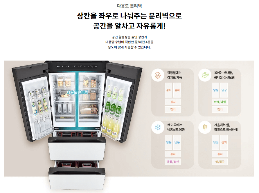 이번 신제품은 상칸을 좌우로 분리하는 다용도 분리벽이 적용돼 상칸 좌·우, 중칸, 하칸까지 독립된 4개 칸을 다용도 냉장고로 폭넓게 쓸 수 있으며 'LG 씽큐 앱'을 통해 각각의 칸을 최적의 온도로 설정할 수 있다. 좌·우칸으로 나눠서 김치와 음료를 보관하고, 가운데·아래로 나누서 잎채소·과일을 각각의 식재료에 맞는 온도로 설정해 보관할 수 있다.